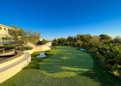 We add unique golf features, including American-style bunkers, Scottish-style bunkers, chipping zones, and water elements for a stunning, functional backyard putting green.
